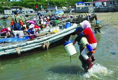記者看到船一靠岸后,每對(duì)夫妻檔就開始爭(zhēng)分奪秒地加工海蜇。三輛專門拉海鮮的冷藏車停在岸邊,漁民們挑一擔(dān)海蜇皮大約是100斤,海蜇販子20日的收購(gòu)價(jià)是每擔(dān)10塊錢。一名乳山客商說,他們要把海蜇皮拉回去批發(fā)。林全強(qiáng)說,青島本地的海蜇有七成來自黃山,每天都有煙臺(tái)、威海等外地客商到碼頭上收海蜇。