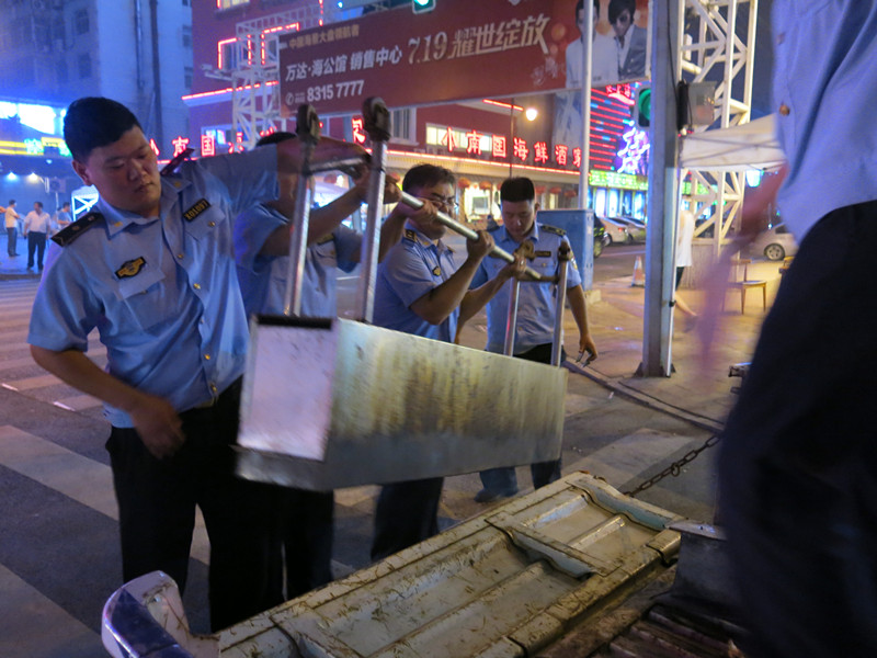 ??? 在夜間執(zhí)法隊來到了閩江路上時,在一處酒店門前發(fā)現(xiàn)了一個“重型”燒烤爐,執(zhí)法隊員告訴記者,“平常見的那種都是簡易型的,這種鐵皮厚、用料也扎實,重量估計上百斤?!弊詈?,五位執(zhí)法隊員合力才將這個“巨無霸”烤爐抬上了執(zhí)法車。