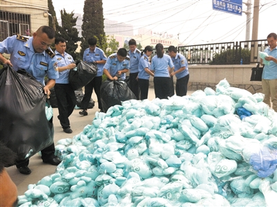 ??? 青島日?qǐng)?bào)/青報(bào)網(wǎng)訊 昨日,李滄區(qū)城管執(zhí)法局執(zhí)法人員集中銷毀收繳的2600多個(gè)“假青青”。