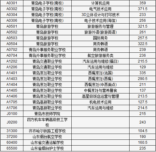 ????職業(yè)學(xué)校錄取分?jǐn)?shù)線中,青島電子學(xué)校(北校)計(jì)算機(jī)應(yīng)用專業(yè)357分、電氣技術(shù)應(yīng)用專業(yè)348.5分、數(shù)字媒體技術(shù)應(yīng)用專業(yè)243.5分、電氣技術(shù)應(yīng)用(華世基)專業(yè)188.5分、電子技術(shù)應(yīng)用(海信)專業(yè)219分;青島電子學(xué)校(南校)計(jì)算機(jī)應(yīng)用專業(yè)359分、電氣技術(shù)應(yīng)用專業(yè)371.5分、3D立體設(shè)計(jì)與打印技術(shù)專業(yè)233分、電子技術(shù)應(yīng)用(海信)專業(yè)256分。青島旅游學(xué)校旅游服務(wù)與管理專業(yè)321.5分、旅游外語(旅游英語)專業(yè)261分、國際商務(wù)專業(yè)257.5分、商務(wù)韓語專業(yè)322.5分。青島外事服務(wù)職業(yè)學(xué)校商務(wù)韓語專業(yè)239分、航空旅游服務(wù)類專業(yè)236分。青島交通職業(yè)學(xué)校汽車運(yùn)用與維修(福日)專業(yè)215.5分、汽車運(yùn)用與維修專業(yè)129分。青島烹飪職業(yè)學(xué)校西餐烹飪(法國)專業(yè)335分、西餐烹飪(西餐)專業(yè)290.5分、西餐烹飪(中西面點(diǎn))專業(yè)211分、中餐烹飪與營養(yǎng)膳食專業(yè)137分、高星級飯店運(yùn)營與管理專業(yè)213.5分。青島高新職業(yè)學(xué)校機(jī)電技術(shù)應(yīng)用專業(yè)127.5分、汽車運(yùn)用與維修專業(yè)214.5分。青島市技師學(xué)院215分。四方機(jī)車車輛高級技工學(xué)校243分。齊齊哈爾鐵路工程學(xué)校104.5分。山東煙臺(tái)航空學(xué)校190分。山東省交通運(yùn)輸學(xué)校160.5分。山東省煙臺(tái)護(hù)士學(xué)校235分。