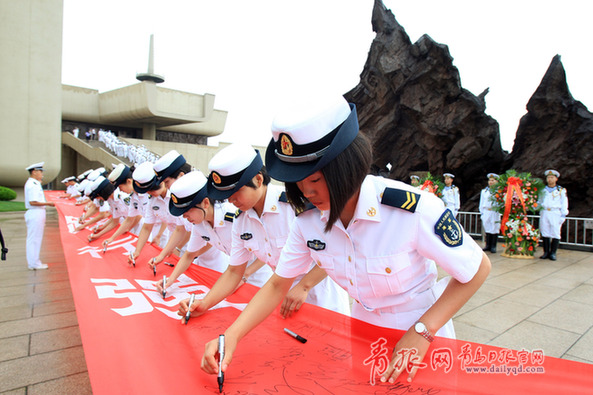 ????李寧在現(xiàn)場接受記者時說,他入伍10年來,一直在劉公島服役,類似的紀念活動參加了數(shù)十次,也多次在橫幅上簽下自己的名字,但唯獨這次紀念活動最讓他刻骨銘心:“今年是甲午戰(zhàn)爭爆發(fā)120周年,我感覺這次簽名,簽的不僅是自己的名字,簽的更是一名共和國水兵的使命和責任。”