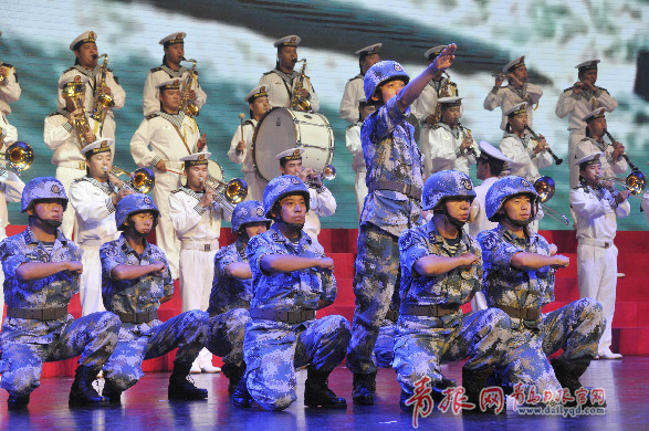 ????歡歌唱兵事,笑語迎佳節(jié)。文藝演出在《中國人民解放軍軍歌》中拉開序幕,分為“鋼鐵誓言、水兵情懷、深藍(lán)夢想、沖鋒號角”4個(gè)篇章,共20個(gè)節(jié)目,通過音樂、歌曲、舞蹈等藝術(shù)形式,從不同角度反映了艦隊(duì)官兵學(xué)習(xí)、訓(xùn)練、工作、生活的場景?!吨袊娀辍?、《祖國在點(diǎn)名》、《假如戰(zhàn)爭今天爆發(fā),有我在》、《發(fā)射手》、《中國海軍核潛艇》等節(jié)目,用鮮明的時(shí)代特征、部隊(duì)特點(diǎn)和青春特質(zhì),表現(xiàn)出了艦隊(duì)全體官兵瞄準(zhǔn)強(qiáng)軍目標(biāo),帶兵打仗、練兵打仗,敢打必勝的良好精神風(fēng)貌。