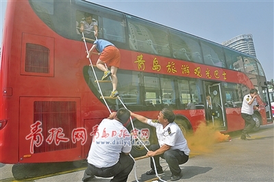 ■7月29日,交運(yùn)溫馨巴士組織了雙層觀光車消防逃生演練,并且為20部運(yùn)營(yíng)車輛配備了消防逃生軟梯。 邢志峰 攝