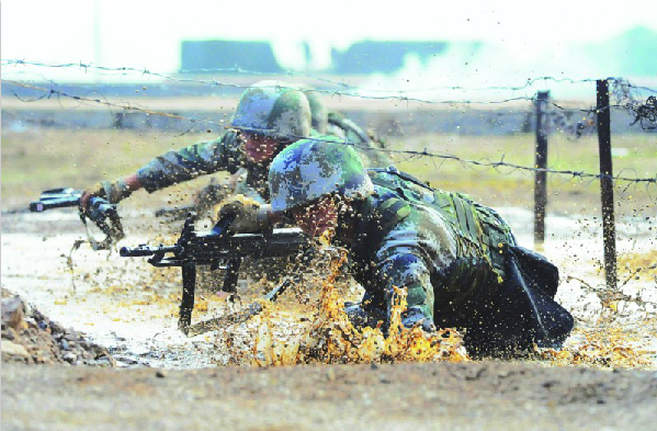 ????由于敵方在機(jī)槍工事內(nèi)拼命抵抗,前方戰(zhàn)士沖擊受阻,班長(zhǎng)根據(jù)戰(zhàn)場(chǎng)情況,立即向上級(jí)報(bào)告,準(zhǔn)確指示目標(biāo),請(qǐng)求火力支援。在上級(jí)火力支援下,步兵班抓住對(duì)方火力被壓制的有利時(shí)機(jī),避開(kāi)敵火封鎖,快速隱蔽接敵。爆破手迅速迂回接敵,對(duì)靶壕右上方的敵機(jī)槍工事進(jìn)行爆破。爆破成功,摧毀敵表面陣地后,步兵班采取向壕內(nèi)投彈、抵近射擊等手段,迅速突入敵陣地,搜索殘敵,結(jié)束壕內(nèi)戰(zhàn)斗。