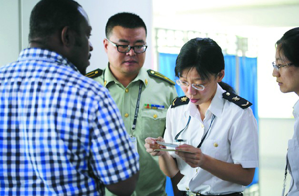 機(jī)場(chǎng)檢驗(yàn)檢疫局和機(jī)場(chǎng)邊檢人員在機(jī)場(chǎng)入境口對(duì)入境人員進(jìn)行詢問。
