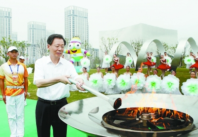 ????昨天,南京青奧組委主席、省長李學勇接過火種護衛(wèi)隊隊員手中的采火棒,點燃火種盆。 本報記者 馮芃 姚強攝
