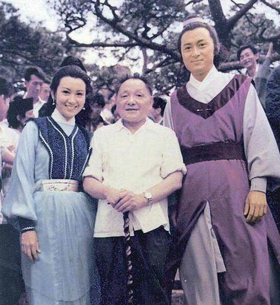 這張照片是鄧小平唯一和香港電影演員的合影。1979年7月11日至16日,75歲的鄧小平登臨黃山,遇上拍攝《白發(fā)魔女傳》的香港劇組。在黃山巧遇國家領(lǐng)導人,劇組于是在拍片現(xiàn)場熱烈邀請鄧小平和該劇兩位主要演員合影。這張照片上,左邊的女演員是鮑起靜,右邊是男演員方平,兩人是同行也是夫妻。