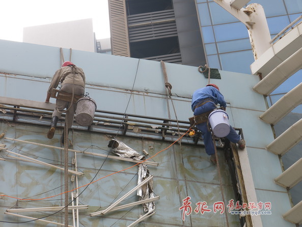 ????22日上午,記者來到太古廣場,香港中路城管執(zhí)法中隊正在進行拆除作業(yè)。相關(guān)工作人員告訴記者:“此處地下是人防工程,大型吊車不能進入,高空作業(yè),我們不在行。只好聘請‘蜘蛛人’,找有相關(guān)資質(zhì)的公司來完成。這四塊燈箱廣告,大約需要兩天時間拆除完畢。也希望市民積極監(jiān)督,對于轄區(qū)內(nèi)任何違規(guī)、違章、亂搭亂建等行為,我們會及時清理?!?/p>