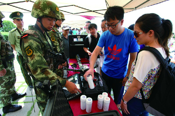 ????在五四廣場,一輛PTU警車也在進(jìn)行展示,特警們身著反恐裝備,威風(fēng)凜凜地站在車旁,圍觀的市民不時向特警們投去羨慕的目光,更對車?yán)锩娴难b備感興趣,一些在廣場旅游的外地游客也紛紛過來一探究竟。社區(qū)將發(fā)放防恐手冊