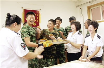 ?? “兵媽媽”教小戰(zhàn)士做中秋月餅。中秋前夕,青島公交八路隊(duì)部分女職工來(lái)到共建單位青島港公安局消防一中隊(duì),和剛剛參軍入伍不能回家過(guò)中秋節(jié)的小戰(zhàn)士一起做月餅,為他們送去了溫暖和祝愿,臨時(shí)客串了一回“兵媽媽”。