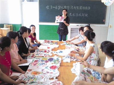 (三)專業(yè)化在提升。為深入貫徹落實《3-6歲兒童學(xué)習(xí)與發(fā)展指南》,全面理解和準(zhǔn)確把握《指南》中藝術(shù)領(lǐng)域精神,提高全園教師對幼兒美術(shù)作品指導(dǎo)評價的專業(yè)素質(zhì)和能力,開發(fā)區(qū)以濱河幼兒園為龍頭,結(jié)合《指南》開展了以藝術(shù)領(lǐng)域和科學(xué)領(lǐng)域的參與式培訓(xùn)活動,解讀華東師范大學(xué)華愛華教授提出的16個問題,總結(jié)了藝術(shù)領(lǐng)域?qū)W習(xí)的核心要點是“三個喜歡”、“一個不字”,總結(jié)了科學(xué)領(lǐng)域的 “一問、二猜、三做、四記、五分享”的五步指導(dǎo)法策略,教師主動參與,提高很大。