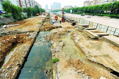 上午11時,記者在李村河?xùn)|段的黑龍江路橋上看到,橋下以西約四五百米的李村河河底已被藍(lán)色施工圍擋圈起來,原先在此銷售舊貨的“破爛市”已經(jīng)不見蹤跡。挖掘機(jī)等施工車輛開始進(jìn)駐施工,半幅河底已經(jīng)開挖,施工現(xiàn)場周圍擺放著成堆的水泥管道。一名施工人員介紹說,他們目前正在前期管線遷改,以確認(rèn)河道內(nèi)的污水管線分布走向,預(yù)計(jì)今后將拓寬加深河底現(xiàn)有的水渠,使其更利于泄洪防汛。