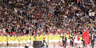 倫敦奧運(yùn)會(huì)擊劍冠軍雷聲高擎鮮艷的五星紅旗,引領(lǐng)中國代表團(tuán)第31個(gè)走進(jìn)體育場(chǎng)。兵強(qiáng)馬壯的中國代表團(tuán)擁有897名運(yùn)動(dòng)員,將力爭(zhēng)連續(xù)第九次稱雄亞運(yùn)會(huì)金牌榜。同時(shí),中國代表團(tuán)還將目標(biāo)確定為運(yùn)動(dòng)成績(jī)與精神文明雙豐收。
