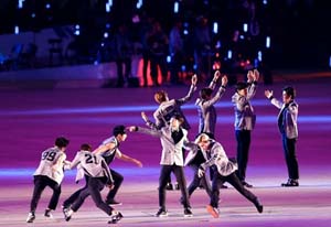 韓國演藝明星在開幕式上出盡風(fēng)頭:曾飾演“大長(zhǎng)今”的韓國女演員李英愛與兩名韓國兒童共同點(diǎn)燃主火炬,使6萬余名現(xiàn)場(chǎng)觀眾陷入沸騰。在以“45億人的夢(mèng)想,同一個(gè)亞洲”為主題的大型文藝表演中,張東健、“都教授”金秀賢、“鳥叔”樸載相等人氣巨星次第出場(chǎng),將現(xiàn)場(chǎng)的氣氛不斷推至高潮。曾亮相北京奧運(yùn)會(huì)開幕式的中國鋼琴家郎朗登臺(tái)獻(xiàn)藝,與樸載相聯(lián)袂奉獻(xiàn)了壓軸表演。在騎馬舞的歡快節(jié)奏中,開幕式曲終奏雅。