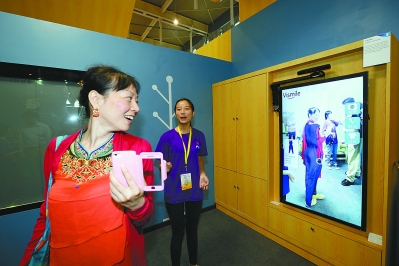9月19日,市民在南京臺灣名品交易會智能生活體驗館內(nèi)的3D虛擬試衣鏡前體驗穿著﹃擬真服飾﹄試衣的樂趣