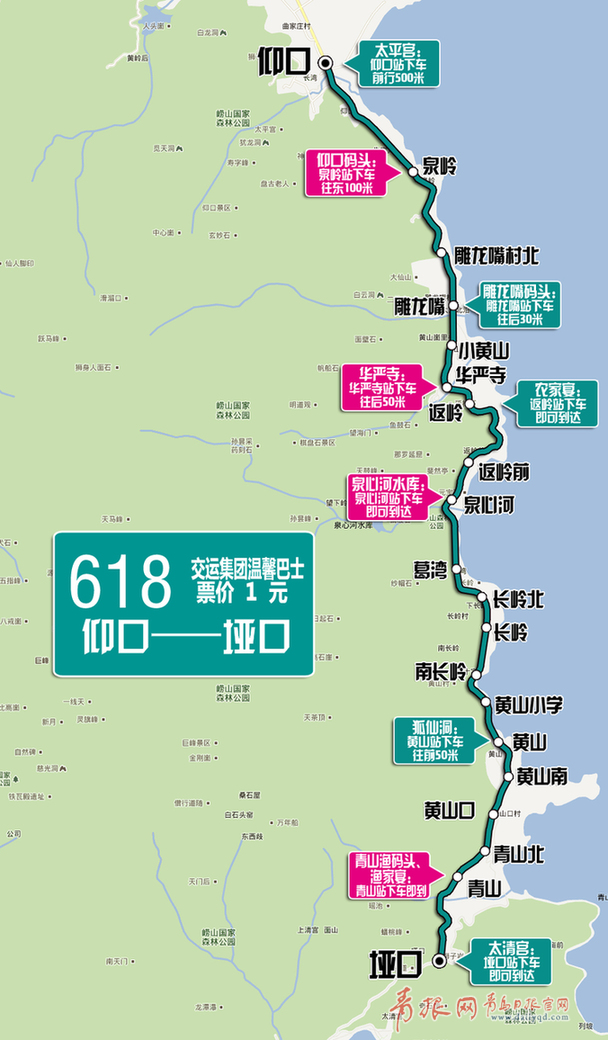 ????經(jīng)了解,618路景點(diǎn)接駁公交全程26.4公里,單程運(yùn)行時(shí)間35分鐘,途經(jīng)太平宮(仰口站前行500米)、仰口碼頭(泉嶺站下車向東步行100米)、雕龍嘴碼頭(雕龍嘴站下車往后步行30米)、華嚴(yán)寺(華嚴(yán)寺站下車向后步行50米)、泉心河大水庫(kù)(泉心河站下車即到)、狐仙洞(黃山口站下車向前步行50米)、青山漁碼頭(品嘗漁家宴)、翻領(lǐng)車站(農(nóng)家宴集中地)、太清宮(埡口站下車即到)等眾多嶗山著名的旅游景點(diǎn)。屆時(shí),該線路實(shí)行定時(shí)定點(diǎn)發(fā)車,具體發(fā)車時(shí)間如下: