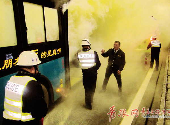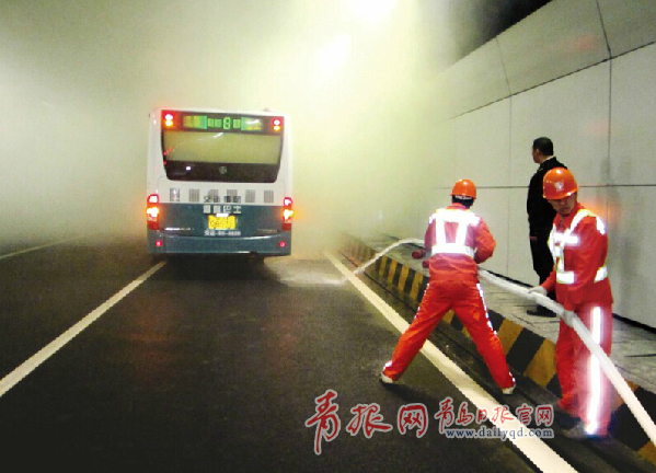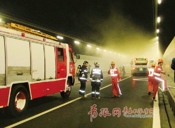 演習中,兩輛各載有乘客30余人的公交車沿青島至薛家島方向在隧道通行,當行進至距洞口約6000米處一車突然發(fā)生自燃,撞擊右側(cè)墻后停車,致使后方行駛的車輛追尾形成碰撞事故。事故發(fā)生后,司乘人員及時向隧道中控報警,并在第一時間指揮乘客逃生和進行火災控制。隧道中控室接到報警后,按應急處置程序進行了報告、指揮,及時派出道口管理員、交通管理員進入事故區(qū)域協(xié)助火災控制與搶救人員并進行事故現(xiàn)場防護、勘察、指揮、疏通道路,指引消防救援車進入現(xiàn)場滅火。滅火結(jié)束后,拖車與牽引車進入將事故車輛拖出,清掃車進入現(xiàn)場清理,演習結(jié)束。