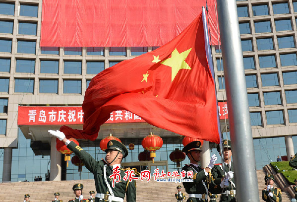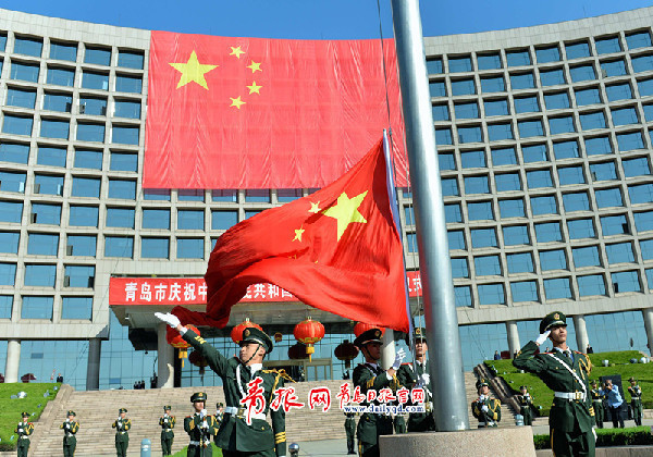 青島市慶祝新中國成立65周年升國旗儀式,今日早晨在市政府大樓廣場前隆重舉行。