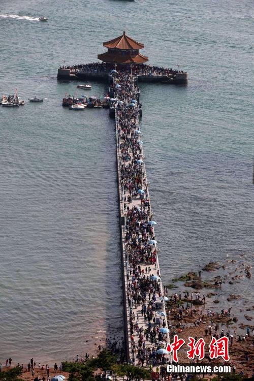 10月3日,十一長期的第三天,青島旅游進(jìn)入高峰期,前海一線,人流如織,棧橋變成人橋。 中新社發(fā) 徐崇德 攝