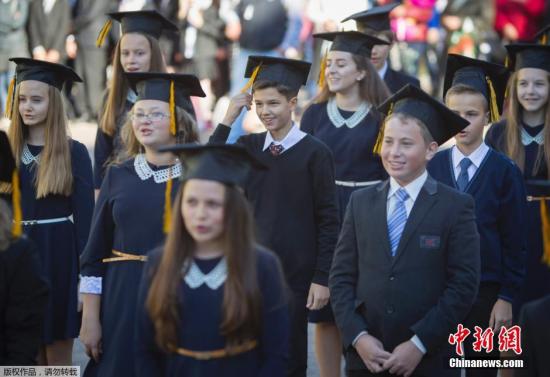 當(dāng)?shù)貢r間2014年10月1日,烏克蘭頓涅茨克,由于戰(zhàn)火而推遲一個月開學(xué)的頓涅茨克學(xué)校終于迎來了開學(xué)首日,學(xué)生們到學(xué)校開始上課。
