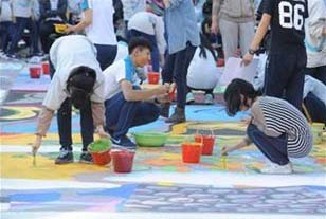 ????“來點(diǎn)紅色,我把五月的風(fēng)畫好?!?1日下午,一名六中的同學(xué)向旁邊負(fù)責(zé)顏料的同學(xué)喊道。從下午1時30分到近5時,近千名六中學(xué)生在教學(xué)樓前的操場上按照班級主題畫畫,有的班級畫出了五月的風(fēng)和棧橋,有的班級畫天主教堂和基督教堂,還有的班級畫出了和平鴿和家園的夢想……經(jīng)過3個多小時的奮戰(zhàn),25幅主題鮮明、構(gòu)思新穎、造型獨(dú)特、色彩艷麗、氣勢恢弘的巨幅大地彩畫在長寬近30米的地面上呈現(xiàn)出來。
