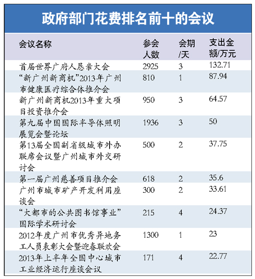 ????具體到單個會議上,記者發(fā)現(xiàn)有些部門開會確實足夠節(jié)省。如市財政局召開的“2014年度全市部門預算工作布置會議”以及城管委召開的“7·10廣州市生活垃圾處理階段總結及再動員大會”花費分別只有4.1萬元和4.7萬元,分攤到每人身上,其每天的花費分別只有不到13元和15元,當然,鑒于這兩個會議開會人數(shù)均有數(shù)千人,又無需住宿或吃飯,花得少也在情理之中。