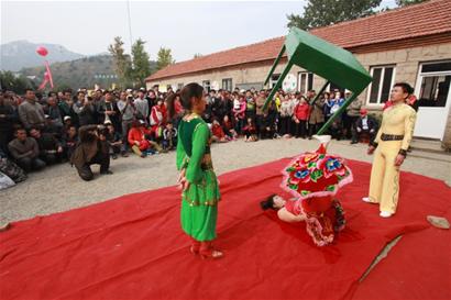 ????此次靈珠山廟會上最精彩的當(dāng)屬雜技表演了,小伙用頭部頂缸非常輕巧,還不時做著各種花樣。美女雜技演員的蹬桌子、蹬大缸表演令人贊嘆不已,大缸由兩到三人合力抬上臺,美女雜技演員表演起來非常輕松,后來在大缸里坐進(jìn)去一名小伙子,演員仍能夠轉(zhuǎn)動大缸,讓人嘆為觀止,博得熱烈的掌聲。