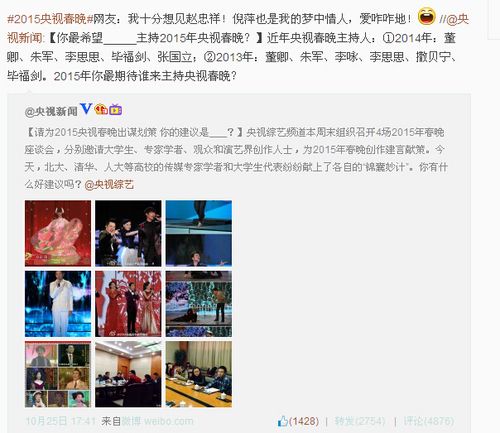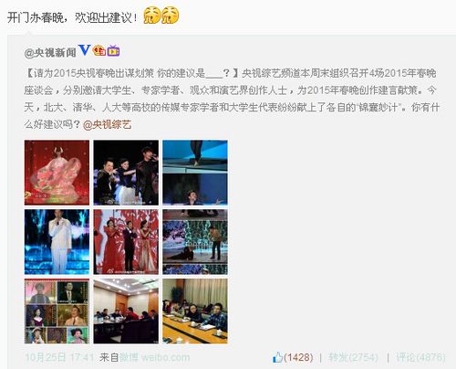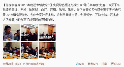 10月25日,央視綜藝頻道官方微博,就發(fā)出了兩條微博,分享了來(lái)自北大、清華、人大、等多所高校的大學(xué)生代表與傳媒學(xué)者為2015年央視羊年春晚獻(xiàn)計(jì)獻(xiàn)策的信息。當(dāng)天下午,央視綜藝頻道則邀請(qǐng)了胡智鋒、尹鴻、喻國(guó)明等知名傳媒專家學(xué)者代表召開(kāi)2015年春晚座談會(huì),他們分別從春晚主題、互動(dòng)參與、藝術(shù)表達(dá)邏輯等方面分享了對(duì)春晚的看法。