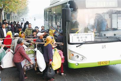 ????“大家都不用急,我們開了專車,待會兒就來了。 ”看見這么多老人挑著扁擔在候車人群中走動,唐建軍趕緊走上前勸阻。 “老人挑著扁擔不注意,萬一打到了坐車乘客,就不好了。 ”唐建軍說,因為賣菜的人中,老人數(shù)量較多,工作日期間隧道1路的客流量又很大,許多市民早晨都急著坐車上班,彼此容易發(fā)生摩擦,路隊也因此收到不少投訴?!坝行┥习嘧宀辉缸屵@些賣菜人坐車,一是容易被他們的扁擔打到,二是嫌他們拿的東西太多,不注意就會弄臟衣服?!碧平ㄜ娬f,最多時,濱海學院車站聚集了70多名賣菜人。因為賣菜人數(shù)量太多,唐建軍不得不每天清晨6時許就在車站維持秩序,即使如此,還是不斷有人打投訴電話。 “我們也沒辦法,賣菜人雖然拿的東西比較多,但他們同樣有權(quán)利乘坐公交車,作為服務窗口,我們不能拒絕他們上車?!碧平ㄜ娬f,這些賣菜人,年齡普遍在60歲以上,令他印象最深的一位老人,今年已經(jīng)83歲了,家住青西新區(qū)王臺鎮(zhèn),賣菜時要倒兩趟車才能趕到濱海學院車站。