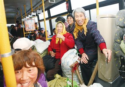 ????26日早晨6時許,太陽剛露出曙光,青島西海岸新區(qū)紅石崖街道龍泉戚家村的戚文宣就挑著扁擔,在濱海學院車站焦急等待隧道1路公交車了。扁擔兩頭,盛著戚文宣凌晨從地里摘的新鮮蔬菜。 6時20分,一輛特別的公交從這里發(fā)車,車上的乘客清一色全是賣菜人。為方便青西新區(qū)多個鄉(xiāng)鎮(zhèn)的人到市區(qū)賣菜,從26日清晨開始,公交隧道公司隧道二隊正式開通“賣菜公交”,每天早上定時發(fā)車,中間不停靠,點對點直接將賣菜人送到團島市場。首日,專車就拉了近40名賣菜人,其中大多數(shù)是免費乘車的老年人。