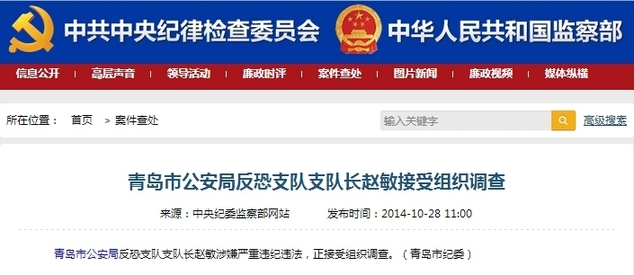????青島市公安局反恐支隊(duì)支隊(duì)長趙敏涉嫌嚴(yán)重違紀(jì)違法,正接受組織調(diào)查。(青島市紀(jì)委)