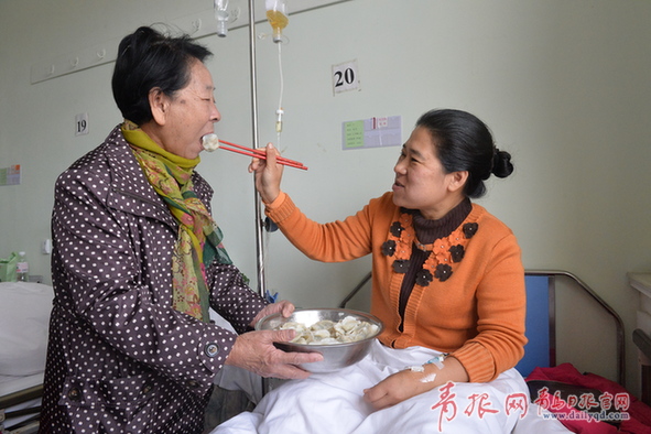 ????青島日?qǐng)?bào)/青報(bào)網(wǎng)訊 10月29日上午11點(diǎn),張莉的病房內(nèi)格外熱鬧,牟淑卿老人給張莉包了“一盆”餃子送來,張莉一口氣吃了十多個(gè)?!皬?2號(hào)生病就沒吃上一頓‘正理八經(jīng)’的飯,這餃子真好吃”,張莉告訴記者。
