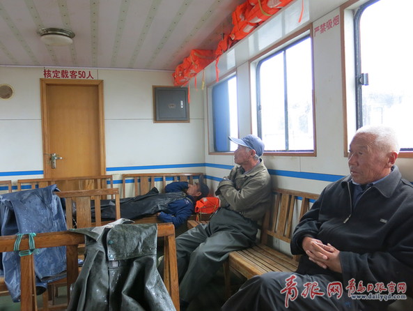 ????開這條船辛苦、枯燥。肖永祿記得,從干擺渡船的那天起,他們四個(gè)就幾乎沒有休息過,十幾年里,天天要耗在碼頭,沒有休息日,大年初一也要出來接人。生活范圍只有“島上——碼頭”這么大點(diǎn),鐘擺一般一天7個(gè)來回。在船上記者觀察到,靠岸后老人們從不上去轉(zhuǎn)轉(zhuǎn),一天時(shí)間幾乎都在船上度過。他們每個(gè)人都有不??磿r(shí)間的習(xí)慣,等待著下一班發(fā)船。常年的磨合,使他們之間沒有一句多余的話。等候過程中,每個(gè)人就在不大的船上自己找個(gè)角落,坐著或躺著沉默。
