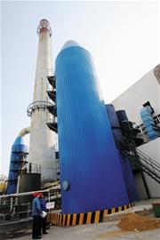 ????昨天上午,記者來到青島能源熱電金灣熱力廠,它們負(fù)責(zé)八大峽區(qū)域的供熱任務(wù),供熱面積100萬平方米左右。在金灣熱力廠煙筒旁,豎立著兩個(gè)巨大的藍(lán)色桶裝物體,它們的嘴巴都伸到了煙筒里?!斑@就是我們的脫硫塔,今年休熱季剛新建的。 ”金灣熱力廠工作人員介紹,金灣熱力廠的前身是雙星供熱,受制于多種因素影響,前期排放無法穩(wěn)定達(dá)標(biāo)。今年4月供熱結(jié)束后,為達(dá)到省環(huán)保廳公布的新排放標(biāo)準(zhǔn),他們投資500多萬元,從6月開始進(jìn)行改造。“短短3個(gè)月左右的時(shí)間,我們就完成了3臺鍋爐的改造任務(wù)。我們采用的是氧化鎂法,為此特意從營口購買了50噸國內(nèi)最好的鎂粉。 ”工作人員介紹說。