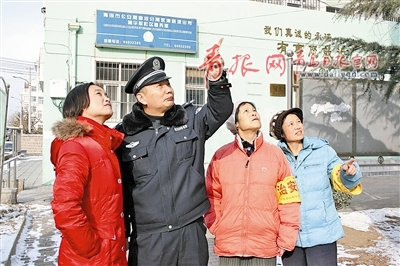 社區(qū)民警帶領(lǐng)治安志愿者巡查社區(qū)治安隱患。