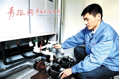 ■青島能源熱電集團的技術人員在湛山路2號為居民調試空氣源熱泵。今年,為提高供熱質量,推動節(jié)能降耗,減少燃煤用量,能源集團能源熱電公司大力推進了供熱計量及節(jié)能改造工程。為分散供熱用戶提供多種供熱方式,滿足居民供熱需求。傅學軍 攝