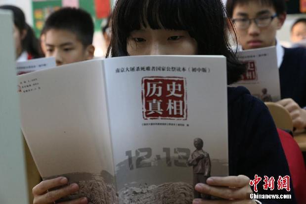 11月13日,《南京大屠殺死難者公祭讀本》(初中版)在南京外國語學(xué)校首發(fā)。《讀本》(初中版)名為《歷史真相》,對(duì)南京大屠殺事件發(fā)生的主要過程和基本內(nèi)容都作了較為詳細(xì)的記述,分為“戰(zhàn)前的南京”、“南京保衛(wèi)戰(zhàn)”、“南京大屠殺”、“救援與揭露”、“歷史的審判”、“記憶與公祭”六部分。其中,“南京大屠殺”是本書重點(diǎn),揭露了日軍集體屠殺、零散屠殺、性侵、搶劫焚燒的暴行,以及民眾不屈抗?fàn)幍氖穼?shí)等。據(jù)悉,繼南京大屠殺死難者國家公祭讀本(小學(xué)版)《血火記憶》、初中版《歷史真相》后,高中版本的讀本還將陸續(xù)出版發(fā)放。圖為學(xué)生們閱讀《南京大屠殺死難者公祭讀本》(初中版)。