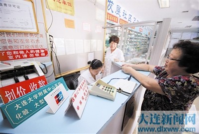 ▲中山區(qū)海軍廣場(chǎng)街道居民在用醫(yī)保卡買藥。 本版圖片由本報(bào)記者王華 攝