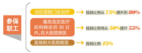 ????根據(jù)新規(guī),參保職工的門診選點依然是一大一小兩家醫(yī)院。但到社區(qū)醫(yī)院門診治療,醫(yī)保報銷比例將從75%提升到80%。經(jīng)基層選定醫(yī)療機構(gòu)轉(zhuǎn)診后30日內(nèi),在其他選定醫(yī)療機構(gòu)和指定專科醫(yī)療機構(gòu)(俗稱“大醫(yī)院”)就醫(yī)的,報銷比例將從50%提升55%,如未經(jīng)基層選定醫(yī)療機構(gòu)轉(zhuǎn)診直接到大醫(yī)院就醫(yī),報銷比例則降為45%。