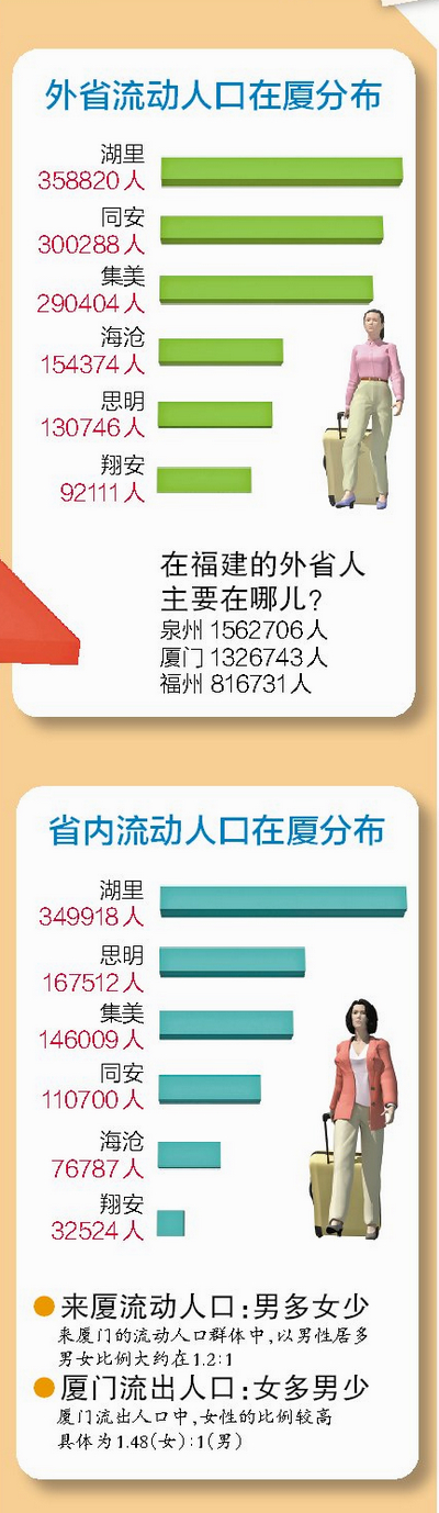省內流入廈門的人口中,從多到少分布分別是湖里(349918人)、思明(167512人)、集美(146009人)、同安(110700人)、海滄(76787人)和翔安(32524人)。