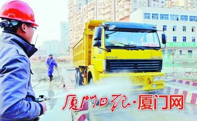 廈門華潤中心(2013P16地塊)工地的工人為出門的渣土車沖洗。