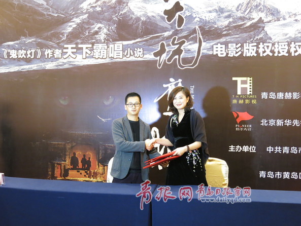 ????青島日?qǐng)?bào)/青報(bào)網(wǎng)訊 12月30日,中國(guó)最具想象力的著名冒險(xiǎn)小說(shuō)家——天下霸唱的《天坑·鷹獵》電影版權(quán)授權(quán)簽 約儀式在青島西海岸新區(qū)舉行,新區(qū)首家本土民營(yíng)資本影視公司——唐赫影視將據(jù)此拍攝一部集動(dòng)作、懸疑 、驚悚等多種元素于一體3D大片。