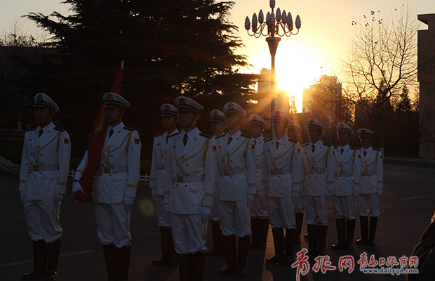 ????早晨不到六點(diǎn),城市還在沉睡。當(dāng)大多數(shù)學(xué)子還沉浸在夢中,朝霞與旭日交輝相映的地方,國旗班的戰(zhàn)士已經(jīng)集結(jié)完畢,等候班長“出發(fā)”的口令。
