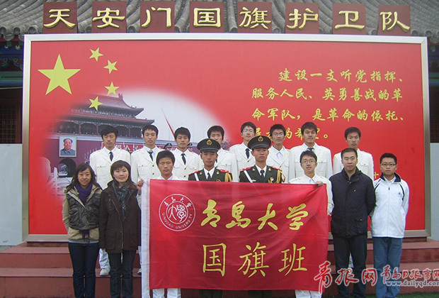 ????這是青大學(xué)生自發(fā)組織的國旗班,最初都是化學(xué)科學(xué)與工程學(xué)院的學(xué)生,從1998年到2014年,16年走過,守護(hù)國旗,步履穩(wěn)重。