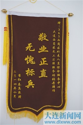 ????在西崗區(qū)365外來人員綜合服務(wù)中心二樓法律援助的窗口前,一面寫著“敬業(yè)正直無愧標(biāo)兵”的大紅錦旗甚是顯眼。這是去年10月錢大姐(化名)專門做來送給張丹律師的。