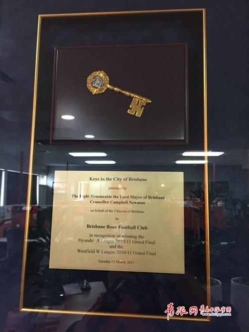 ????在獅吼俱樂(lè)部,波拿芬切擔(dān)任策略主管。由于昨天是周日,俱樂(lè)部并不上班,得知記者想到俱樂(lè)部看一看,波拿芬切欣然打開(kāi)了辦公室大門。這是一間再普通不過(guò)的辦公室,被隔斷分成了約20個(gè)工作位,只有墻上掛著的幾幅照片,提醒人們這里是一家足球俱樂(lè)部。辦公室里,最引人注目的物件當(dāng)屬布里斯班市長(zhǎng)在2011年3月頒發(fā)給獅吼俱樂(lè)部的城市金鑰匙,這是為了表彰該俱樂(lè)部的男足和女足在2010-2011賽季包攬澳大利亞頂級(jí)聯(lián)賽冠軍。