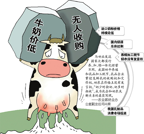 ????去年下半年以來,在國際奶價走跌、國內(nèi)乳品消費不振等因素直接推動下,一些乳品加工企業(yè)限收停收生鮮乳,我國部分地區(qū)出現(xiàn)賣奶難現(xiàn)象,“倒奶殺?!睍r有發(fā)生,在廣東少數(shù)養(yǎng)殖散戶也出現(xiàn)了同樣現(xiàn)象。我國200萬奶農(nóng)如何才能跳出“倒奶殺牛”乳業(yè)魔咒?