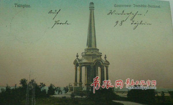 ???1901年1月27日,第二任膠澳總督葉世克病逝。為表彰這位“最嚴(yán)峻時刻的堅強(qiáng)有力而且遠(yuǎn)見卓識的領(lǐng)袖人物”的殖民“業(yè)績”,同年夏天,德皇威廉二世命令膠澳為葉世克建紀(jì)念碑一座。1904年初,葉世克紀(jì)念碑建成。