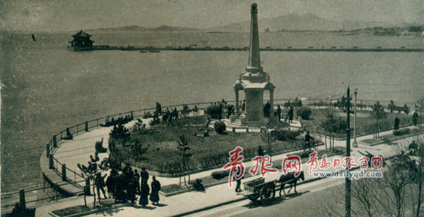 ????《青島通鑒》載:“葉世克紀(jì)念碑位于市政廣場南端,面向青島灣,共三層,用大理石砌造,碑座和碑體呈對稱的六邊形,碑體外環(huán)六根立柱,高丈余,為青島前海一景?!?/p>