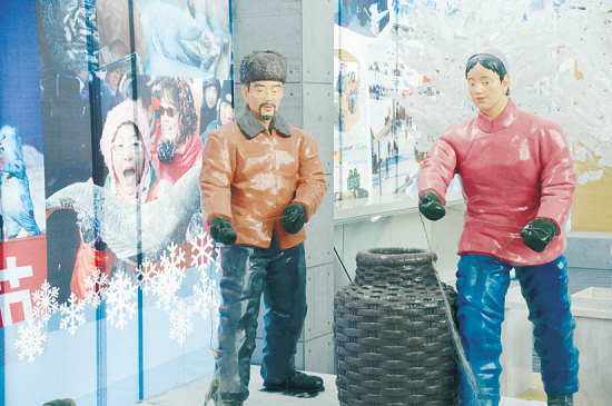 ????現(xiàn)場可以看到,與冰雪有關(guān)的雪摩托、造雪機、拖牽等實物,還有冰雕雪雕模型、玻璃鋼制作的冬捕再現(xiàn)場景等等。最引人注意的是一個原始的雪板,由木板下加皮毛構(gòu)成。